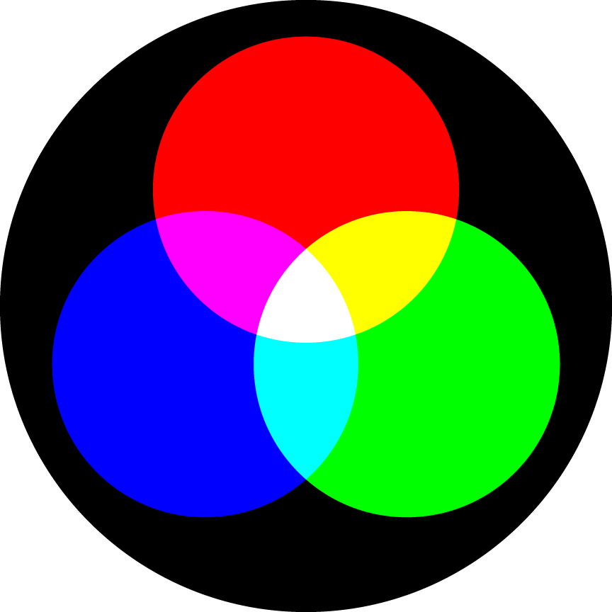 La synthèse additive des couleurs permet le mélange de couleurs par « addition ». Elle utilise le modèle RVB (RGB en anglais); c’est à dire qu’elle utilise comme couleurs de base le Rouge, le Vert, et le Bleu (Red, Green, Blue en anglais).